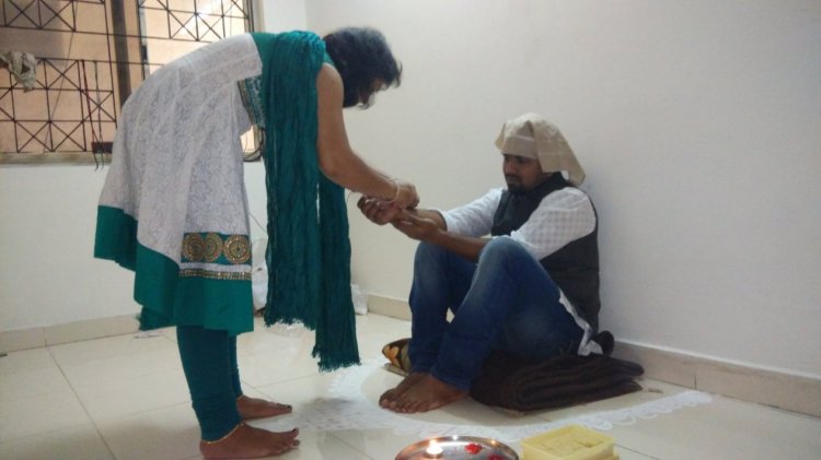 In 2015, I was in Bangalore with my first sister Minu Tai, so, we decided to celebrate it at my apartment in a traditional fashion. My other sisters Shubhu Tai & Dikshu Tai sent their Rakhis to her so that she can tie them on my wrist. We dressed up in a nice traditional outfit to commemorate the occasion. We had our friends, Akash and Harshal, to accompany us during the ceremony which was really cool.