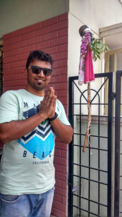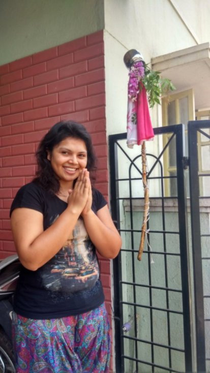 And here’s my sister, Minu Tai, posing with the Gudi. The pose that she is flaunting here is the Namaste pose which is used while greeting each other (in India) and mostly while praying to the deity.