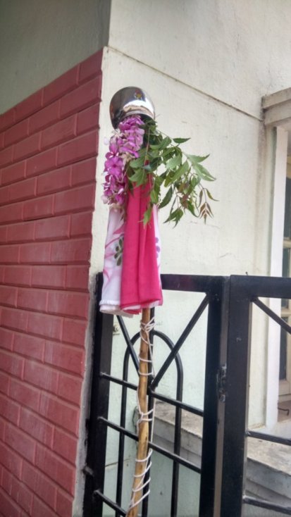Now, comes the actual part of the celebration/ceremony. The setting that you see below is called Gudi. I am sure this is how it is spelled and pronounced as Goo-Dee. So, to construct this, you take a long stick. You wrape/drape a saree at one end of this stick. Remember that this end is going to be the TOP end of the stick. Then you decorate this some flowers, gifts, and what not. You top it off with a steel cup which you can clearly see in the picture below.